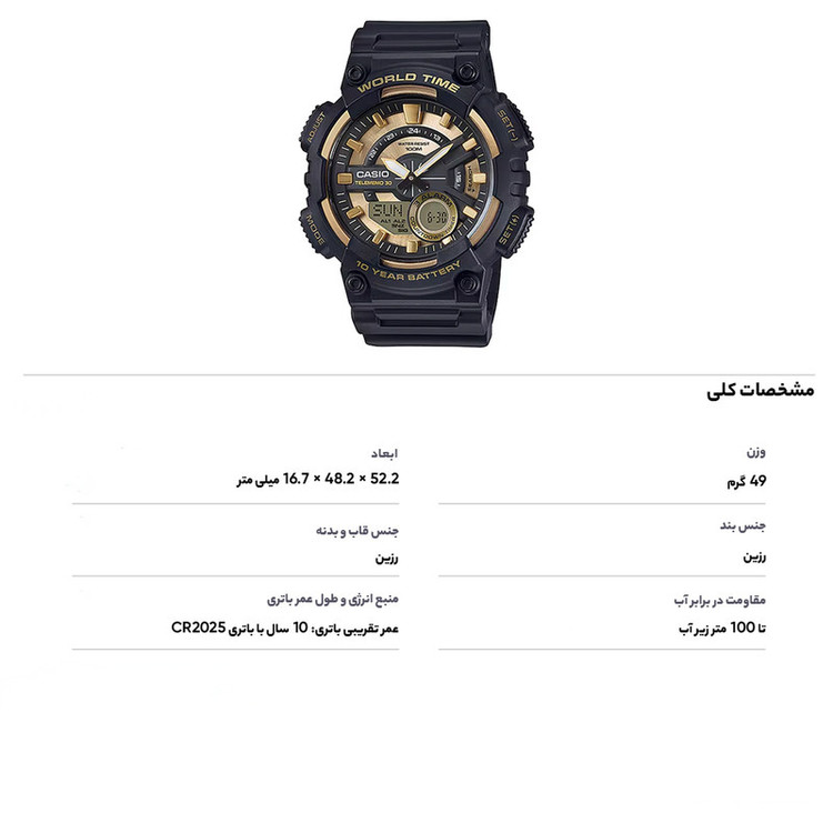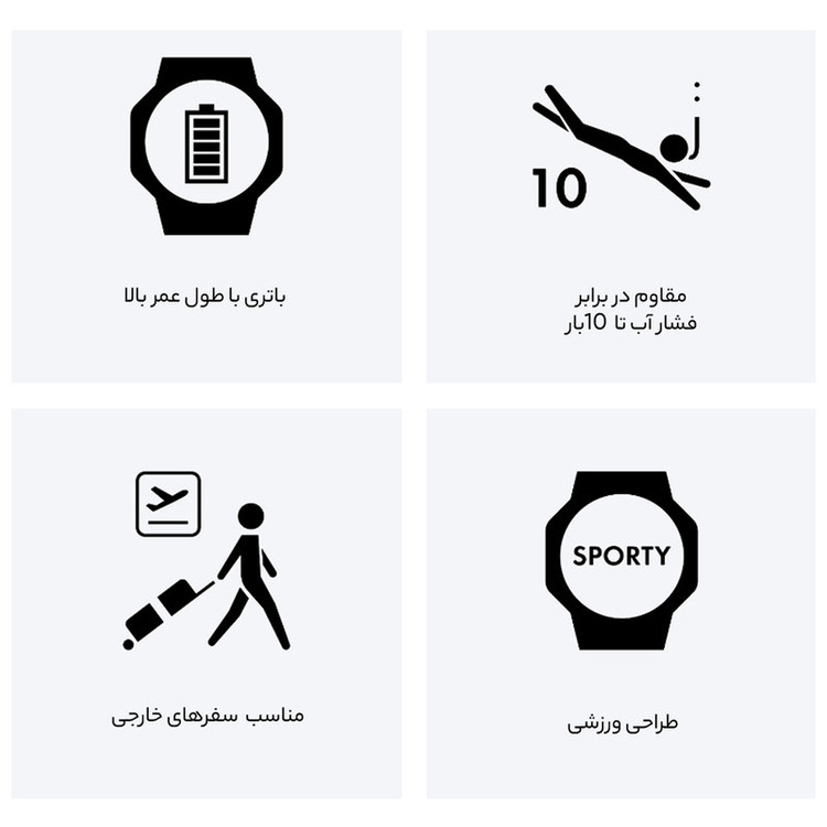 تایمر , عقربههای شبتاب , نمایش 24 ساعته , نور پس زمینه , تاریخ شمار , کرنوگراف , ضد آب , آلارم