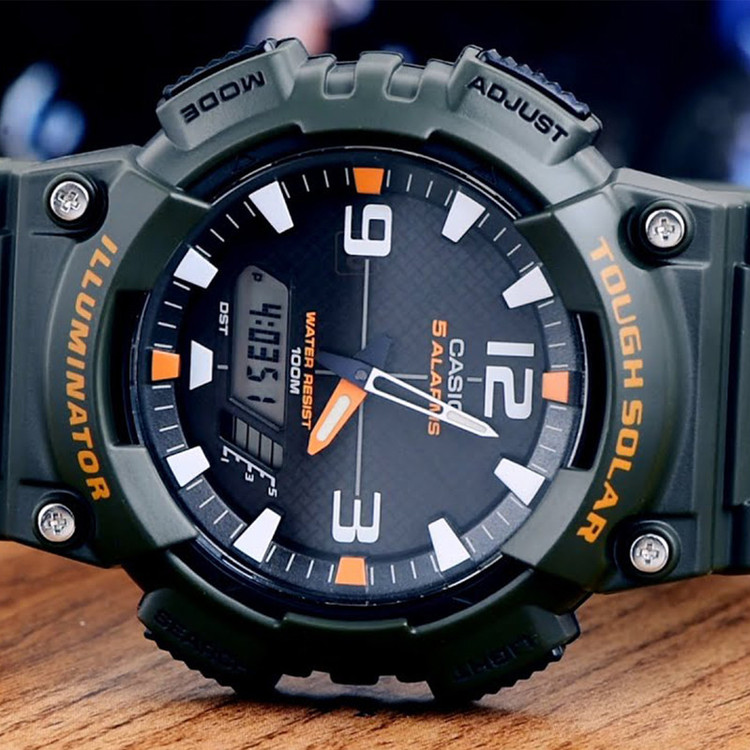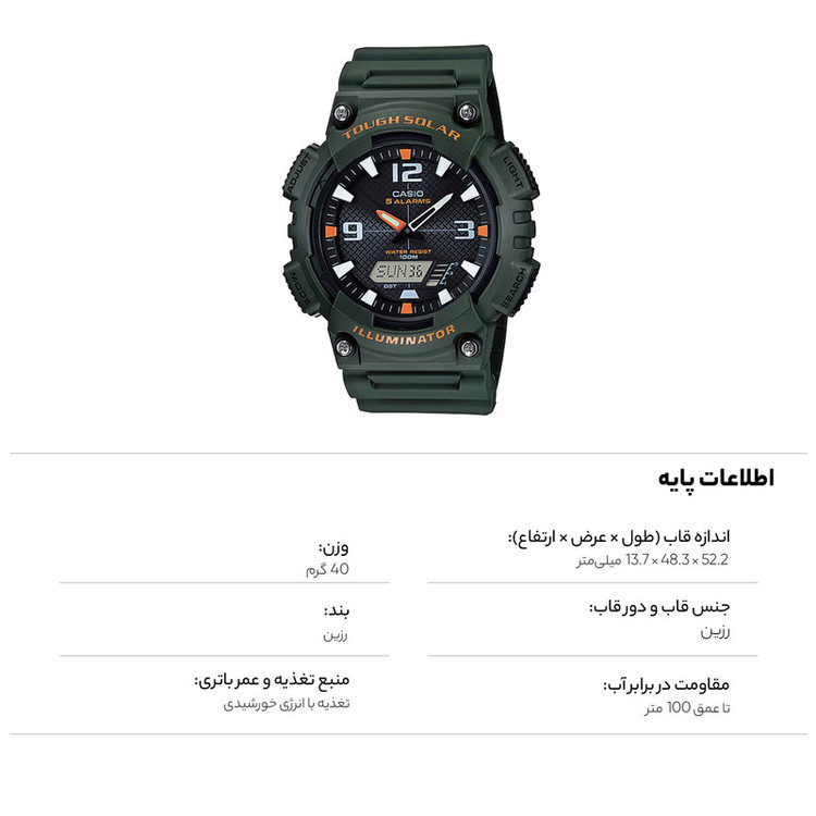 تایمر , نمایش 24 ساعته , عقربههای شبتاب , تاریخ شمار , نور پس زمینه , آلارم , کرنوگراف , ضد آب