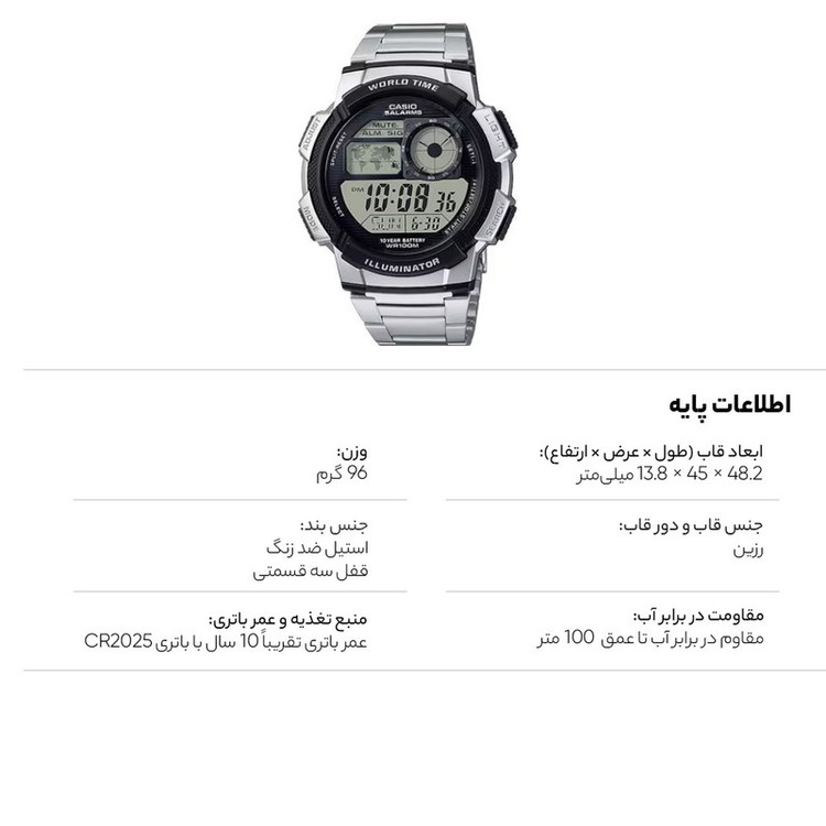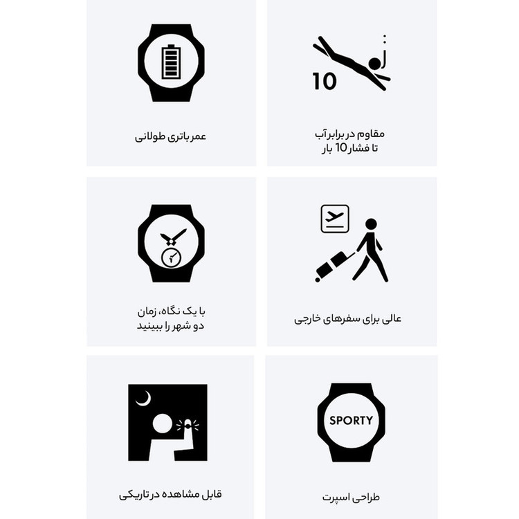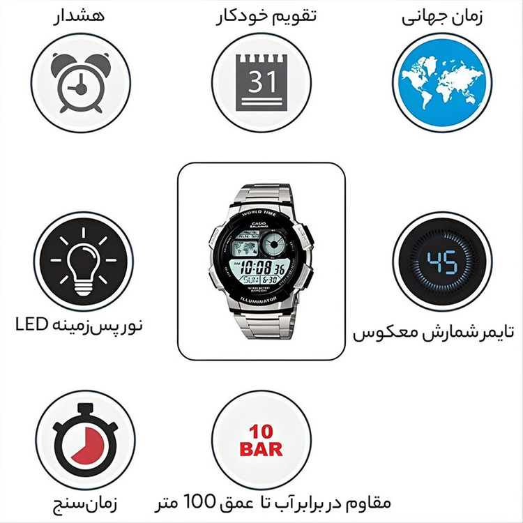 نمایش 24 ساعته , تاریخ شمار , نور پس زمینه , تایمر , آلارم , کرنوگراف , ضد آب